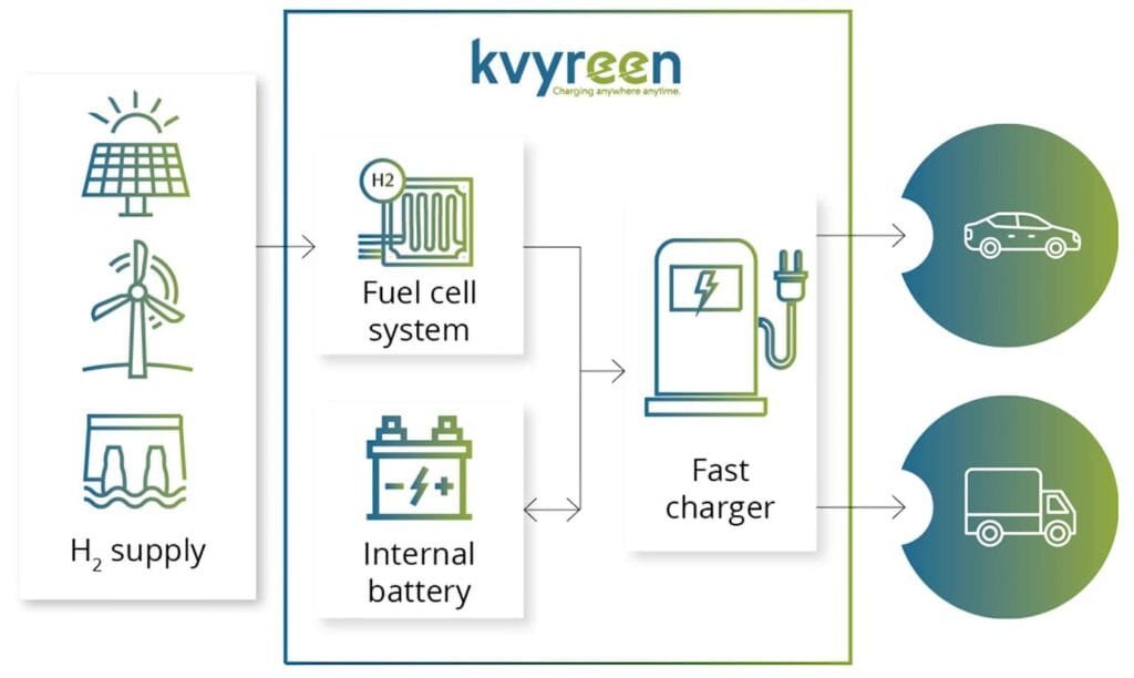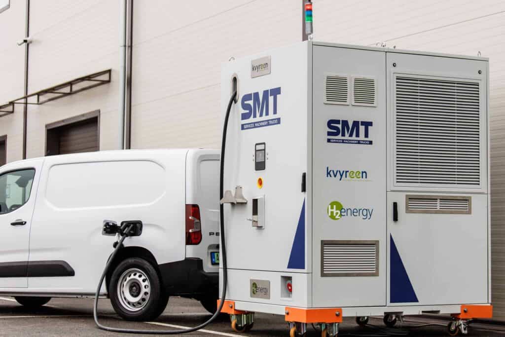 Launched in 2023, the kvyreen 80 charger is based on an 80 kW hydrogen fuel cell from Toyota and includes integrated battery and power electronics to deliver fast charging over CCS-2 for battery electric vehicles and equipment. The unit is capable of being integrated into public charging networks, can be used for private or to charges fleets, like the application with SMT Netherlands. The unit can operate fully off-grid and just needs a hydrogen supply, which can be provided by bundle, container or a fixed infrastructure. The technology has been deployed in the field since 2022 and has a solid track record of reliable and safe operation.